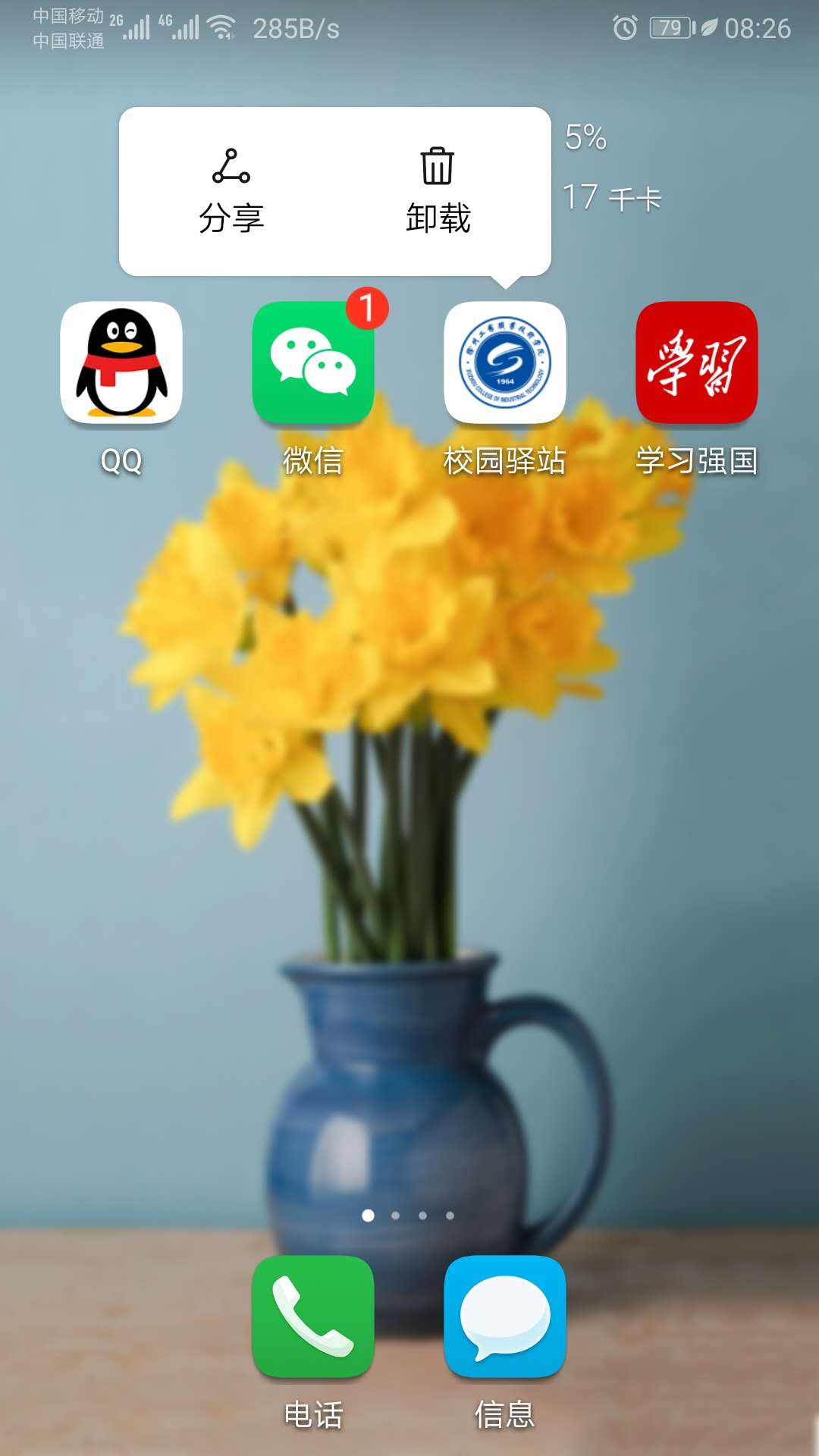 方法3:请同事分享校园驿站给您,按住校园驿站图标不松手,出现如下图所示,点击分享